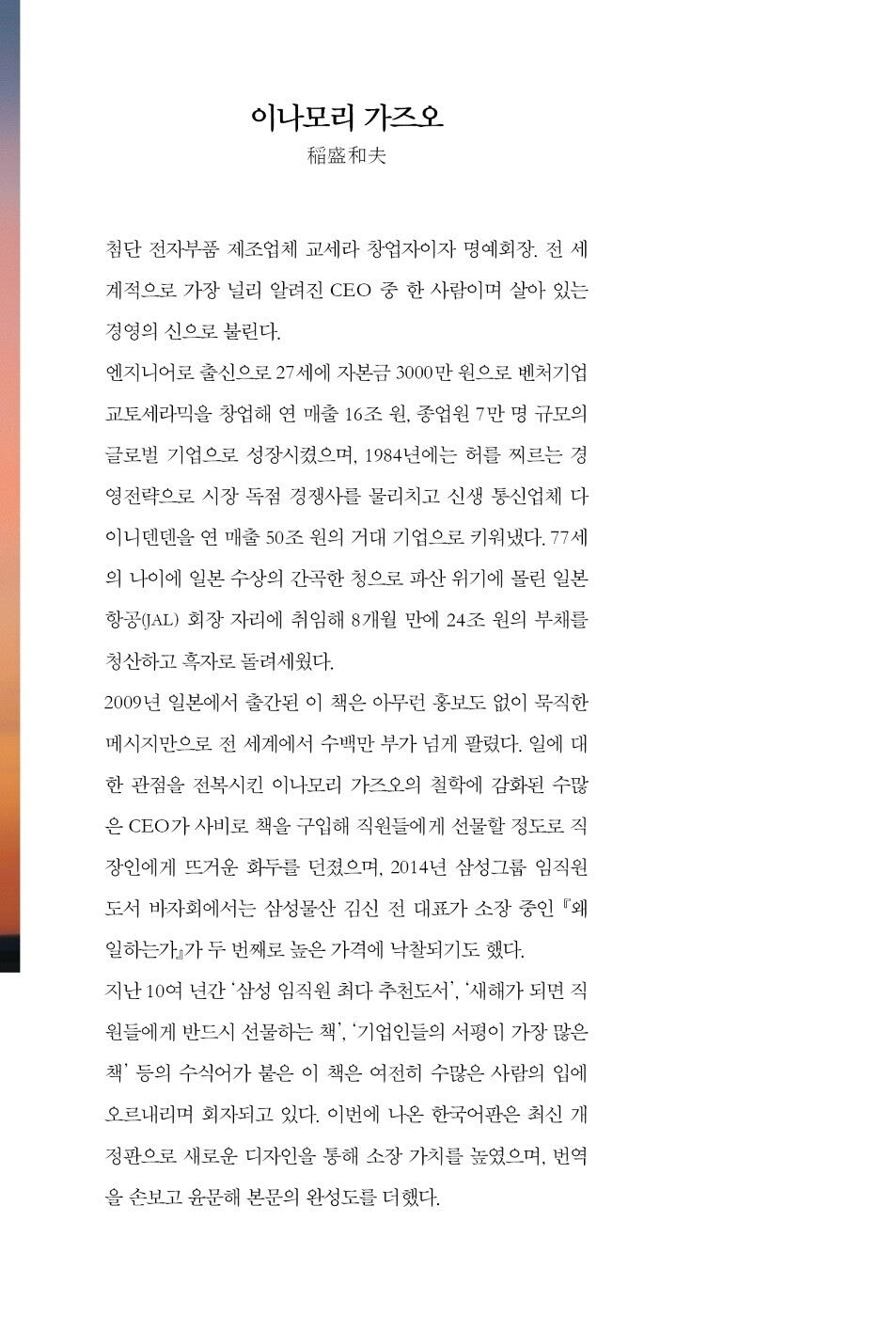 이 책의 저자는 바로 동양의 살아 있는 ‘경영의 신’으로 불리는 이나모리 가즈오 회장이다.