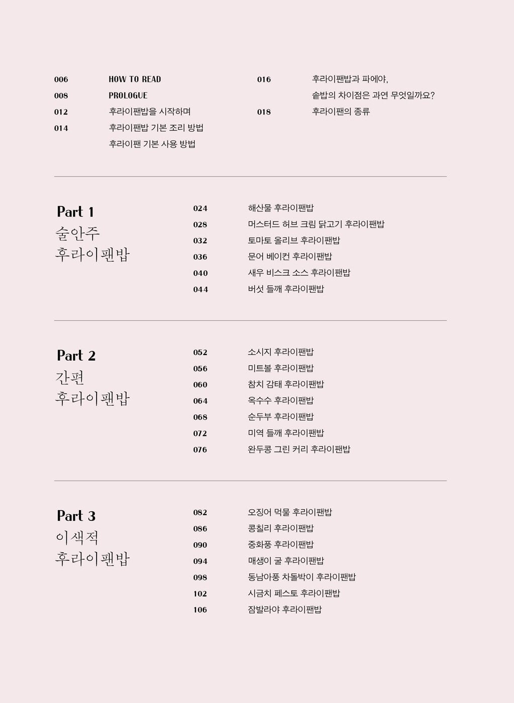 후라이팬은 볶음 요리를 만드는 익숙한 조리도구이지만 후라이팬으로 밥을 짓는 다는 것은 생소하게 생각한다. 찬밥과 남은 재료들을 볶아 만드는 볶음밥이 아닌 모든 재료의 맛이 하나하나 살아 있고 쌀에 고스란히 그 맛이 스며들여 궁극의 맛을 자아내는 후라이팬밥. 솥밥이 많은 사랑을 받는 요즘, 보다 새롭고 간단한 조리법으로 보기에도, 맛도 좋은 후라이팬밥을 소개한다.